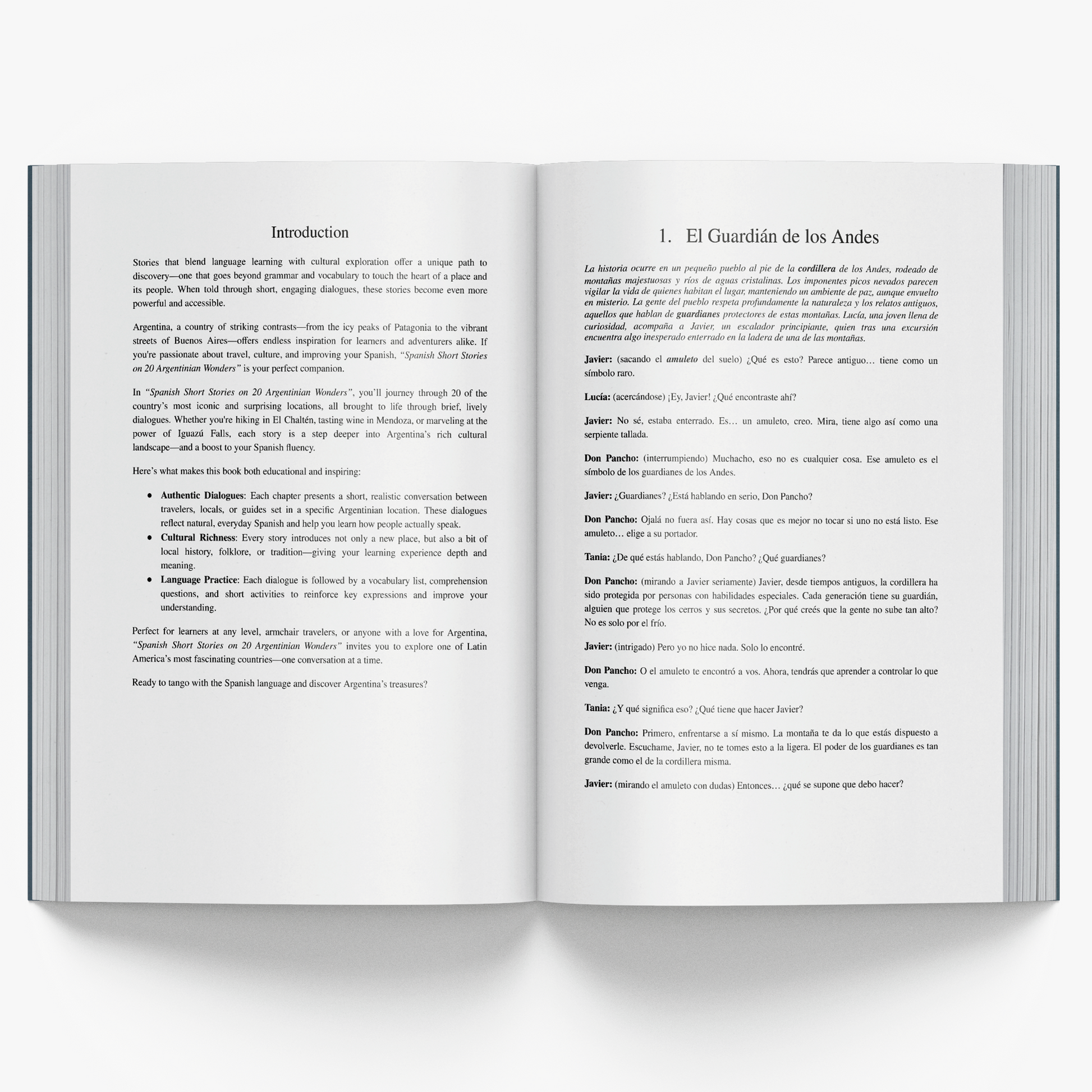 Explore the richness of Argentina with Spanish Short Stories on 20 Argentinian Wonders. This book features 20 short dialogues in Spanish, set against iconic Argentine backdrops—from the majestic Iguazú Falls to vibrant Buenos Aires streets. Perfect for Spanish learners, these engaging conversations help you build vocabulary, improve comprehension, and immerse yourself in real-life cultural scenarios.