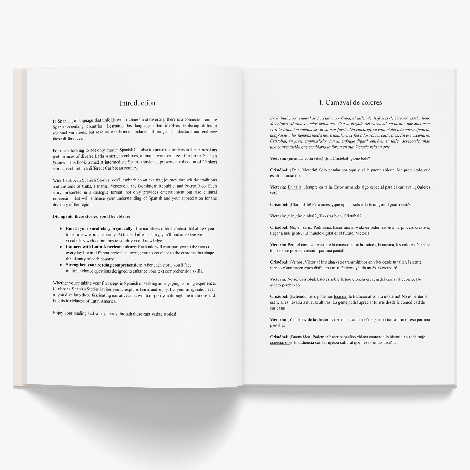 Dive into Caribbean culture and improve your Spanish skills with Caribbean Spanish Stories! This book offers 20 engaging short stories set in Cuba, Puerto Rico, the Dominican Republic, Panama, and Venezuela, complete with vocabulary and interactive exercises to reinforce learning. Explore authentic dialogues and daily experiences to make language learning both immersive and enjoyable.