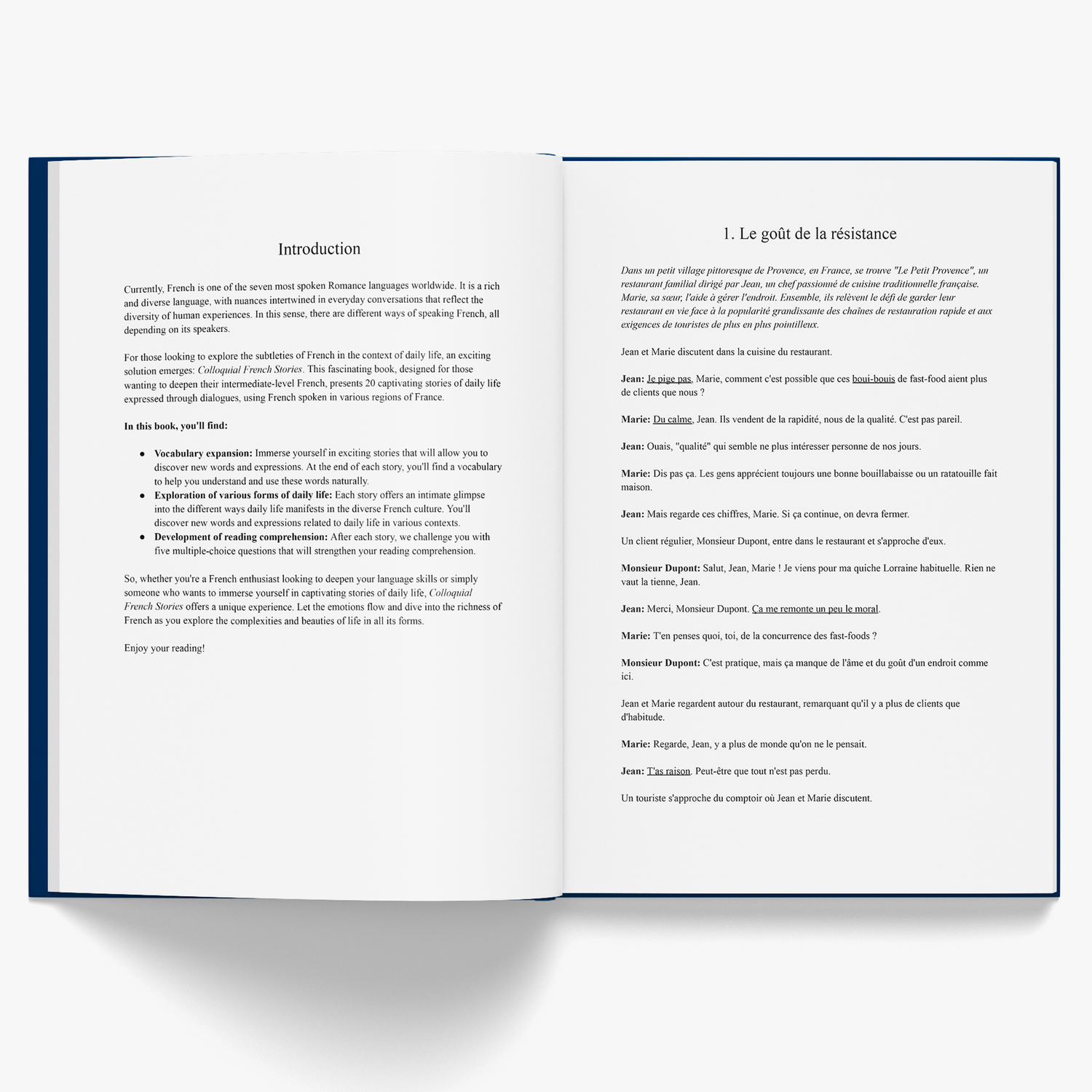 This book brings together a collection of short stories designed to reflect the rhythm and expressions of spoken French. Each narrative combines cultural themes, practical dialogues, and natural phrasing, giving readers a valuable bridge from textbook language to real-world communication. With carefully explained vocabulary and exercises, it makes learning French both accessible and immersive.