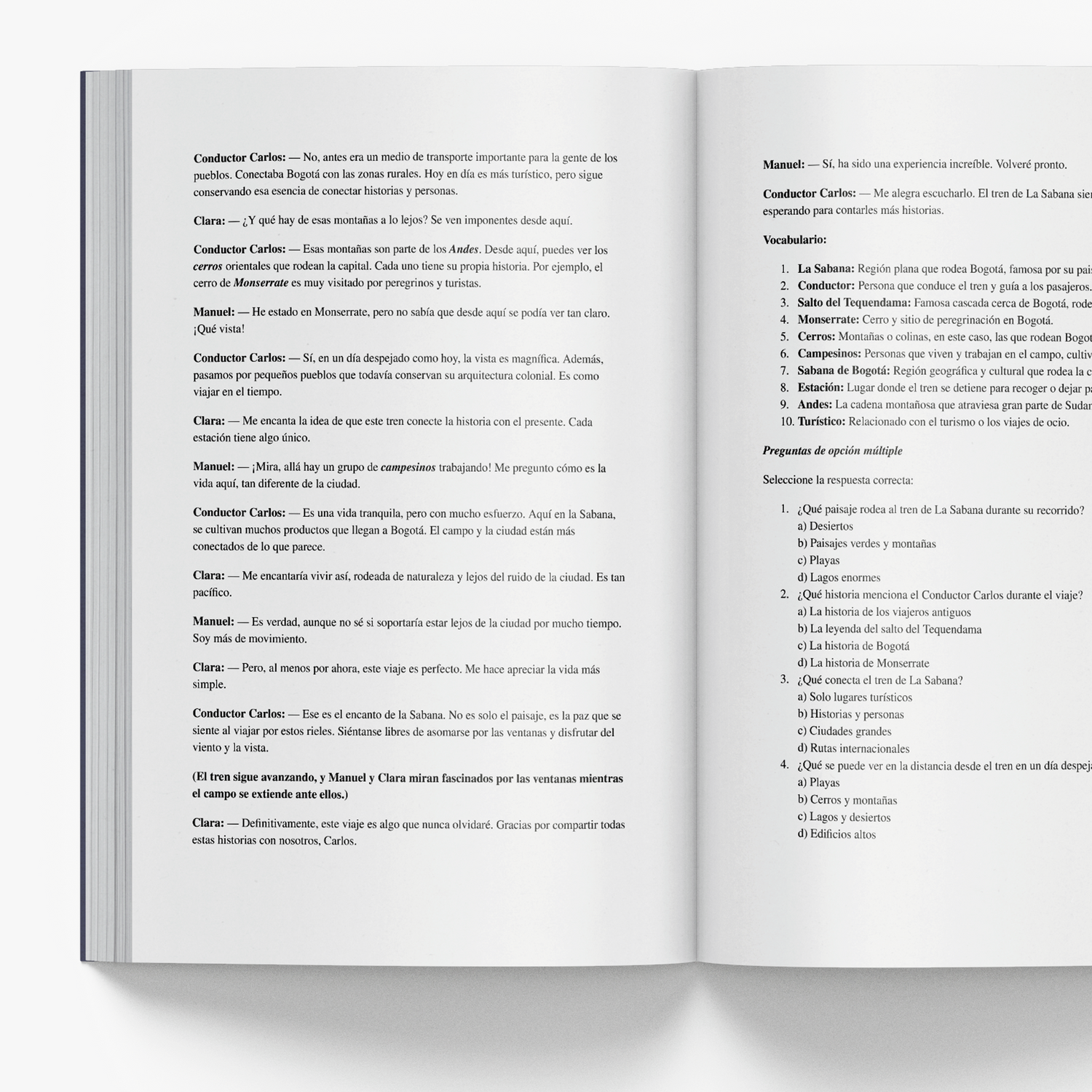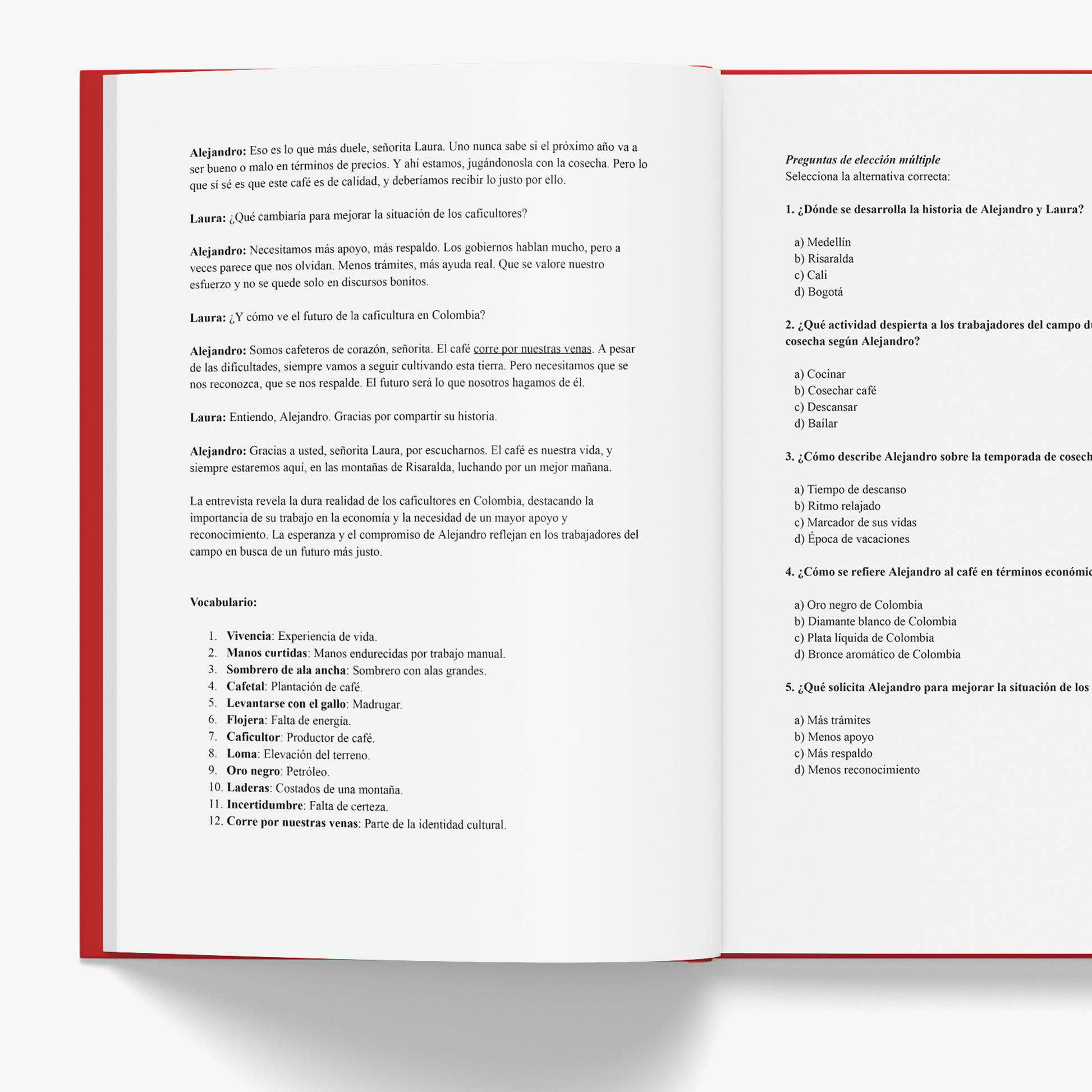 Learning Approach: Practical, phrase-based learning combined with progressive reading materials. Designed to strengthen comprehension, fluency, and cultural knowledge in Colombian Spanish through a balance of vocabulary building, contextual storytelling, and engaging exercises.