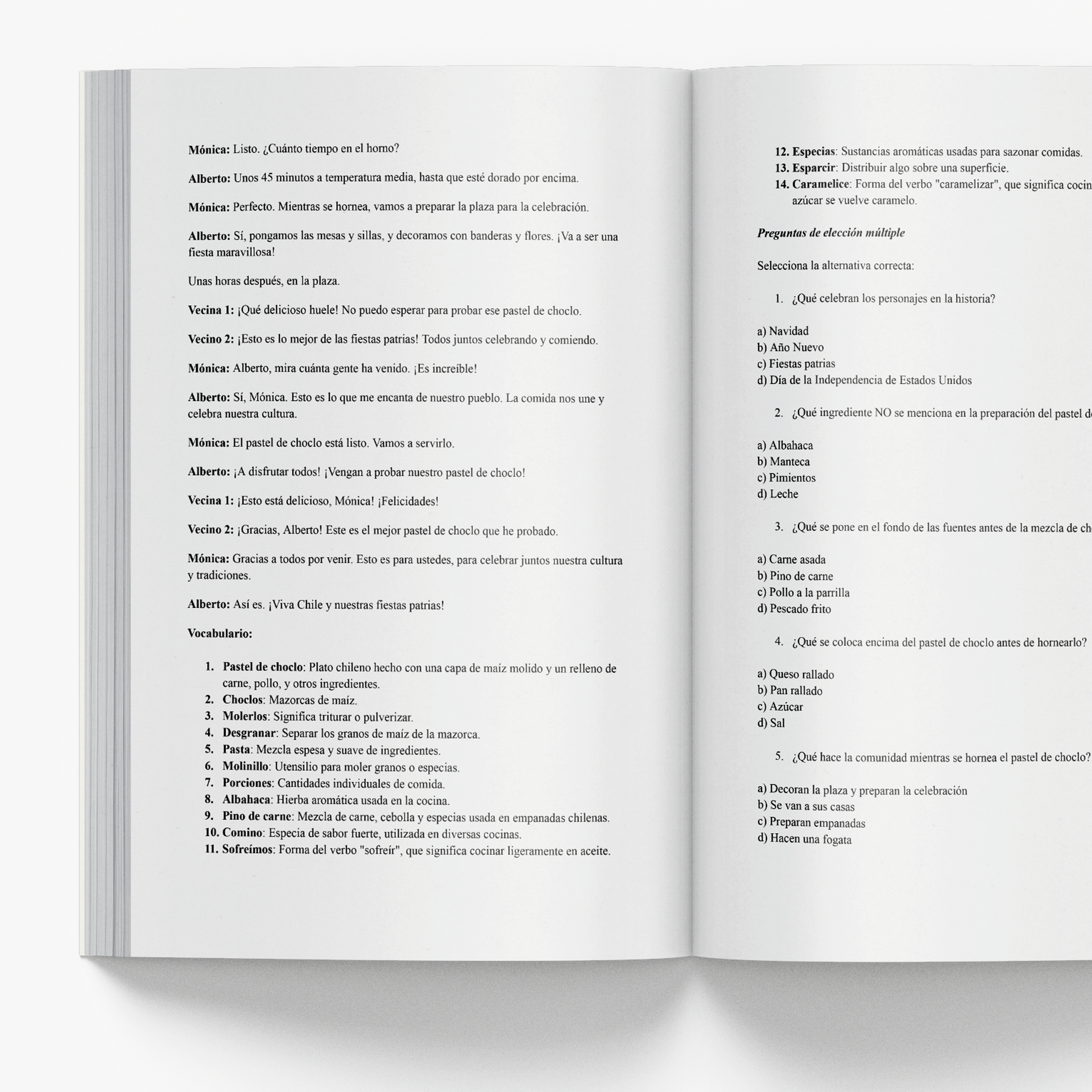 The recipes and stories are written in Spanish, but each includes a vocabulary list to help you understand key cooking terms and expressions.