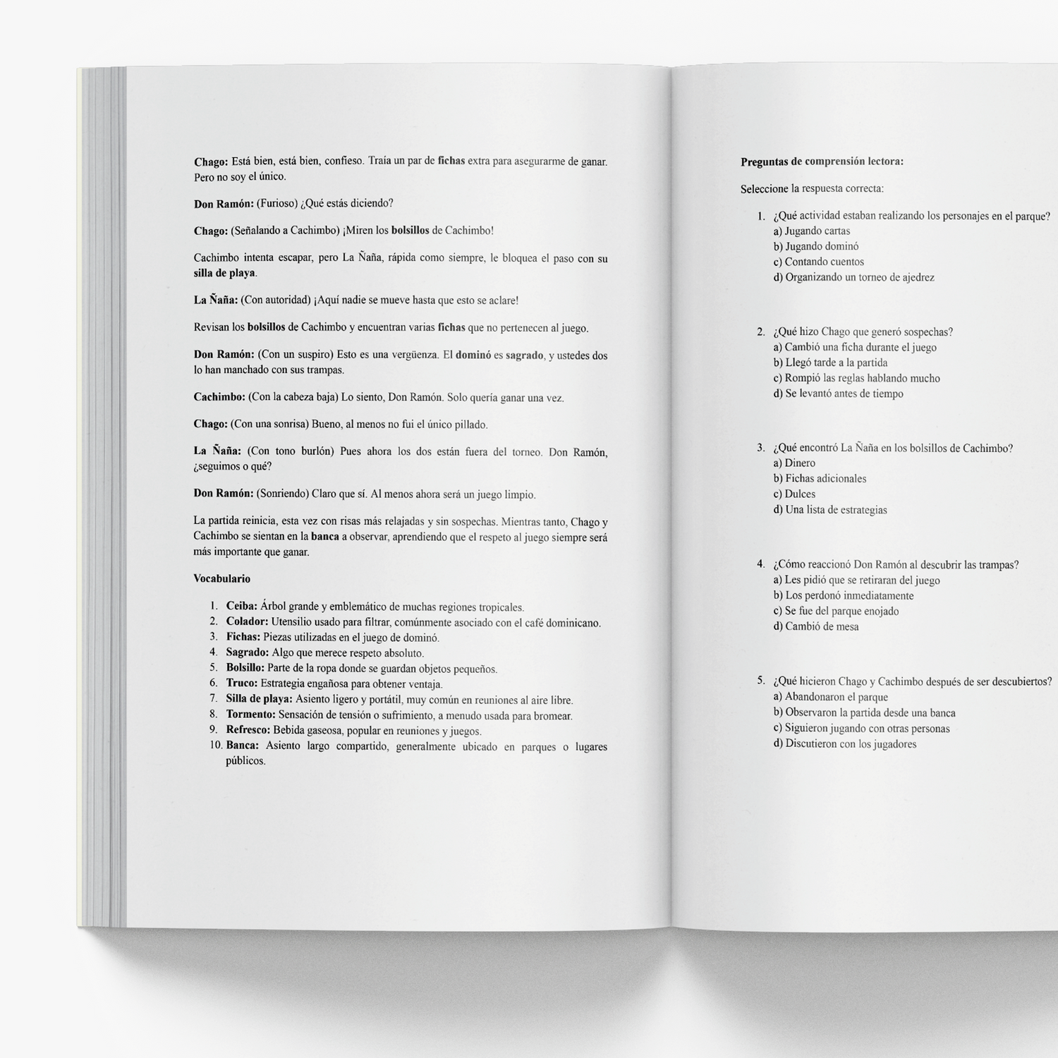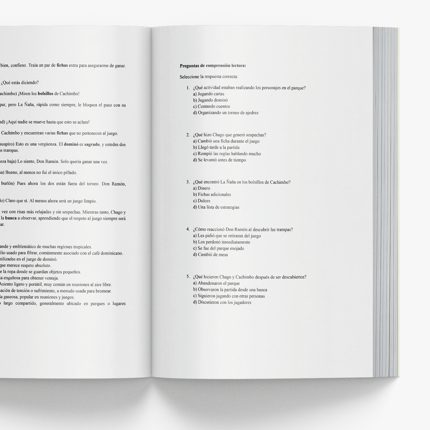 Este libro está pensado para estudiantes con nivel intermedio, como se indica en los detalles y en la sección de Preguntas Frecuentes. No incluye traducciones al inglés porque muchas expresiones del español dominicano no tienen equivalentes exactos. Preferimos mantener su autenticidad y presentarlas en contexto, tal como se usan en la vida real.