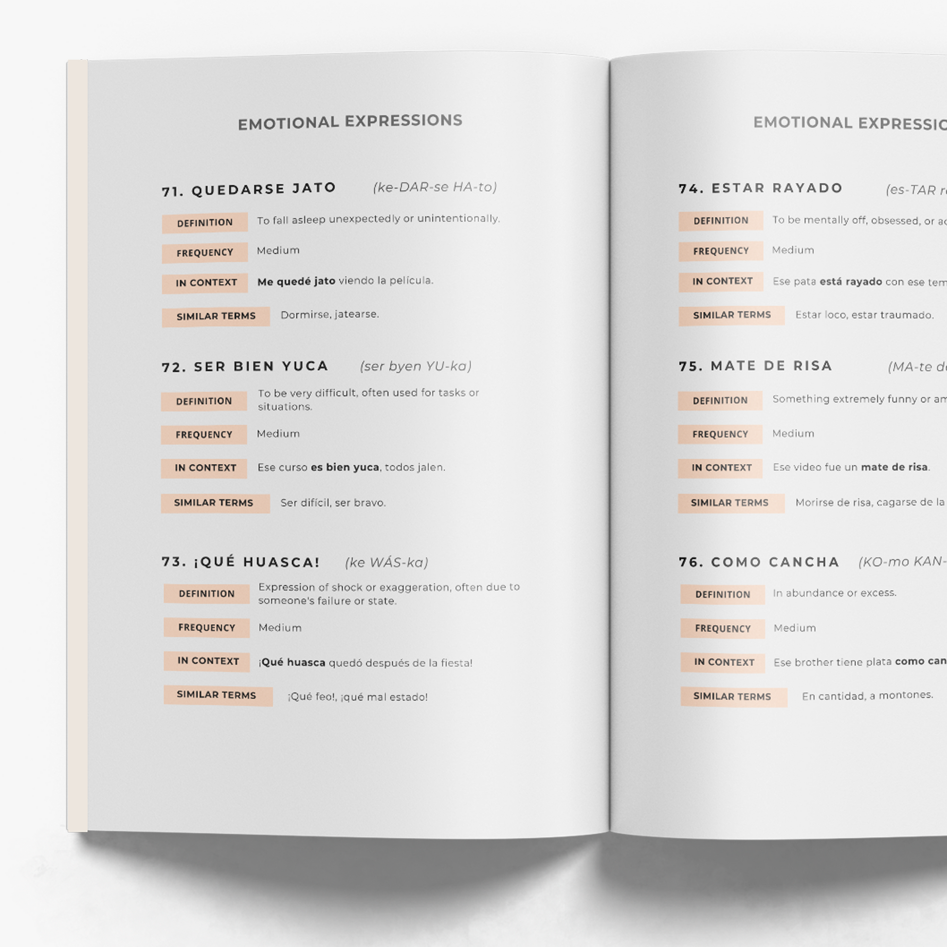 - Content: 200 essential phrases with usage examples + expressions, and slang from Peru, Colombia, and Argentina