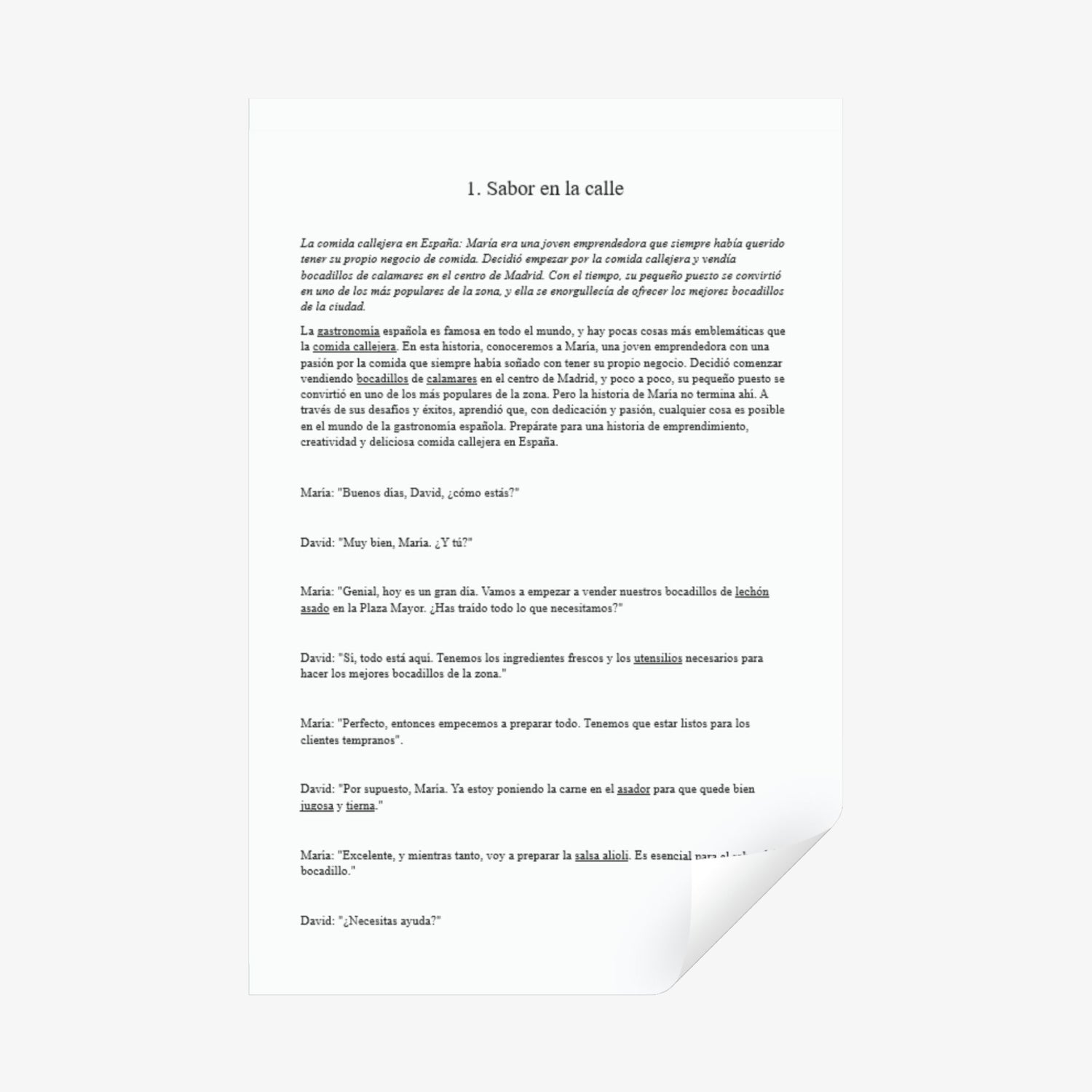 Dive into the rich flavors of Spain with Spanish Culinary Stories. This book combines language learning with Spanish gastronomy, featuring 20 short stories centered on iconic dishes, culinary expressions, and food-related slang. Perfect for food lovers and Spanish learners, it offers vocabulary, expressions, and exercises that make learning Spanish fun and practical.