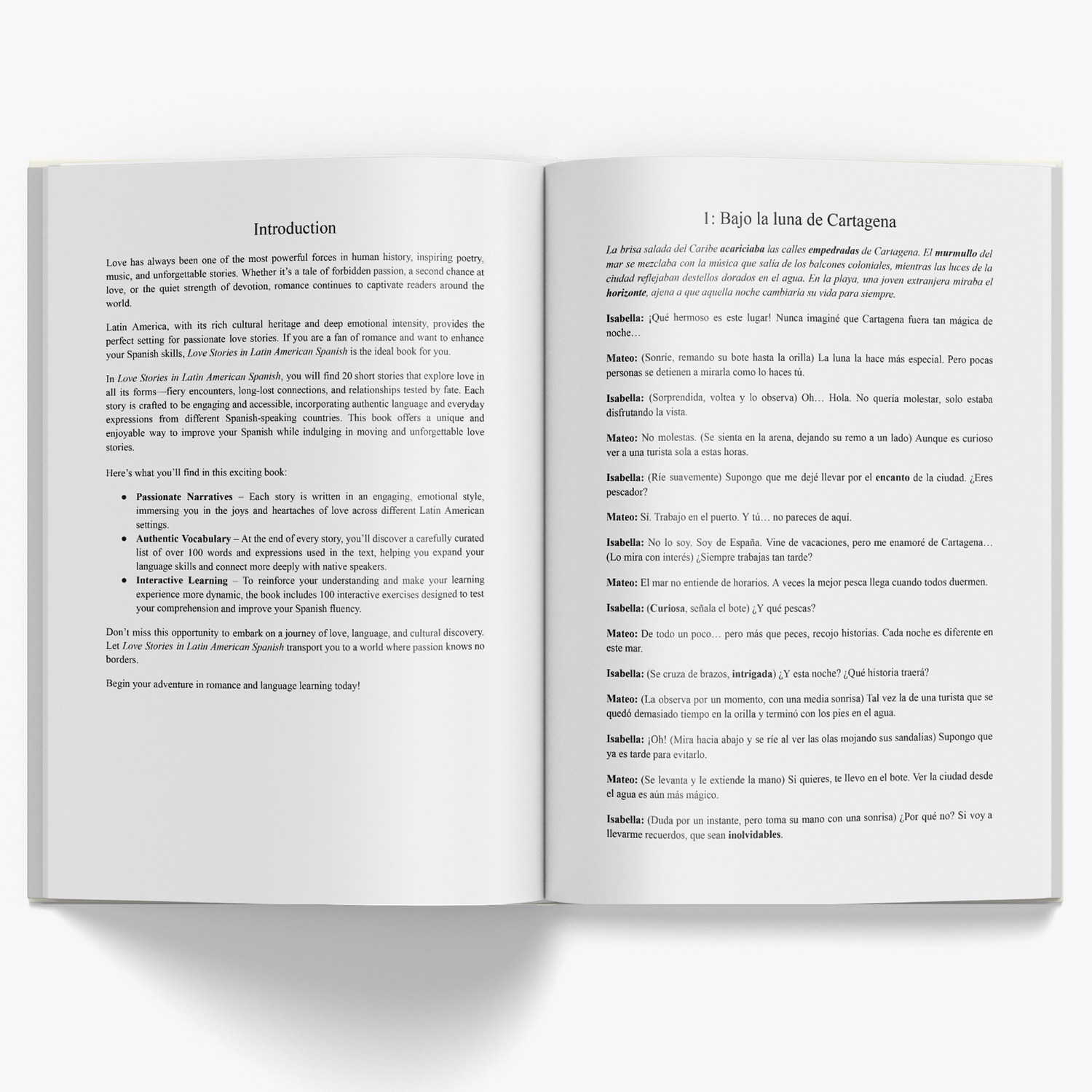 Fall in love with Latin American Spanish while exploring 20 romantic short stories that reveal the passion, culture, and everyday expressions of Latin America. Perfect for intermediate learners, this book blends language learning with emotional, relatable tales that teach authentic vocabulary, grammar, and idioms in context. Discover cultural insights, build conversational skills, and enjoy the art of storytelling.