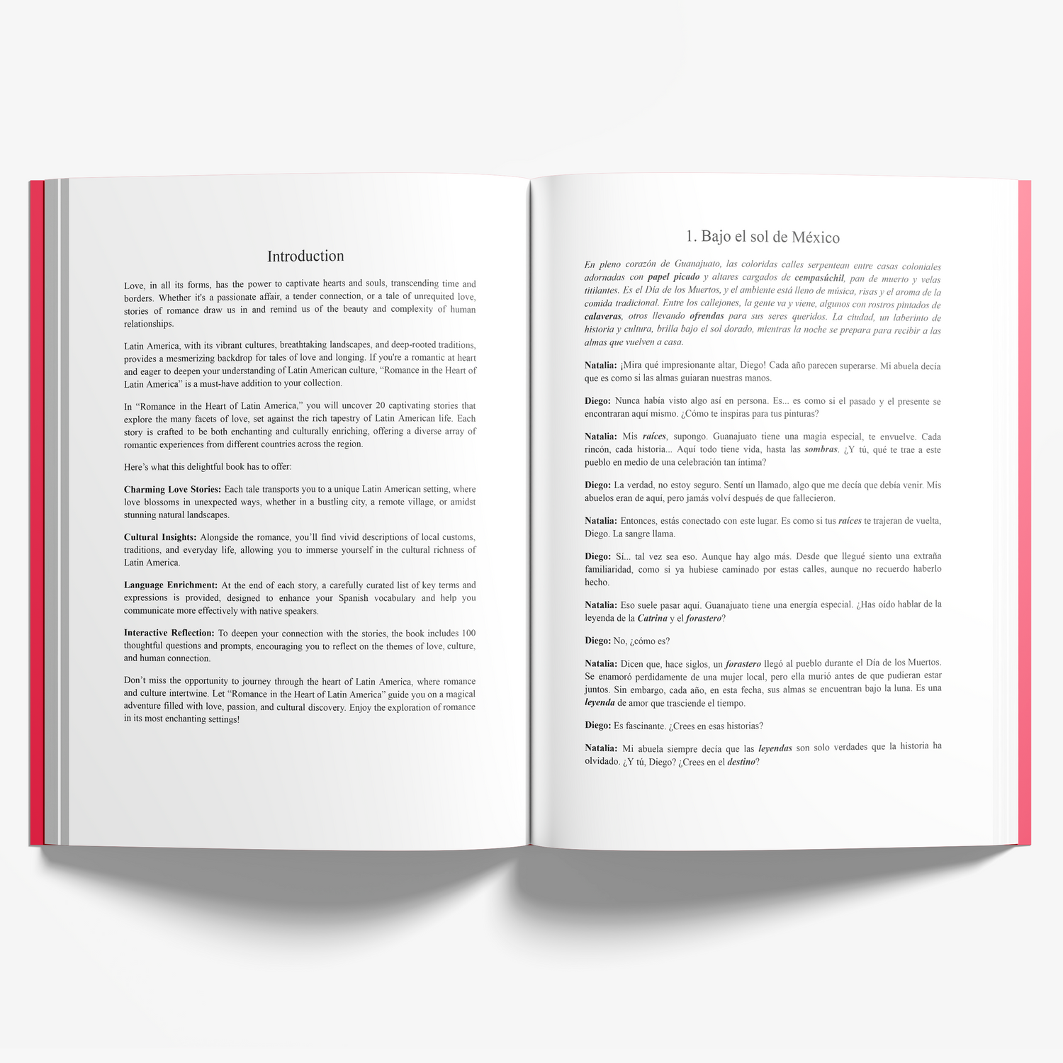 This book presents twenty captivating stories where romance intertwines with authentic Latin American traditions, settings, and emotions. Each tale is designed to enrich your Spanish learning experience by combining engaging narratives with cultural immersion. The balance between storytelling and language focus makes this resource unique, offering readers both entertainment and a powerful tool for practice.