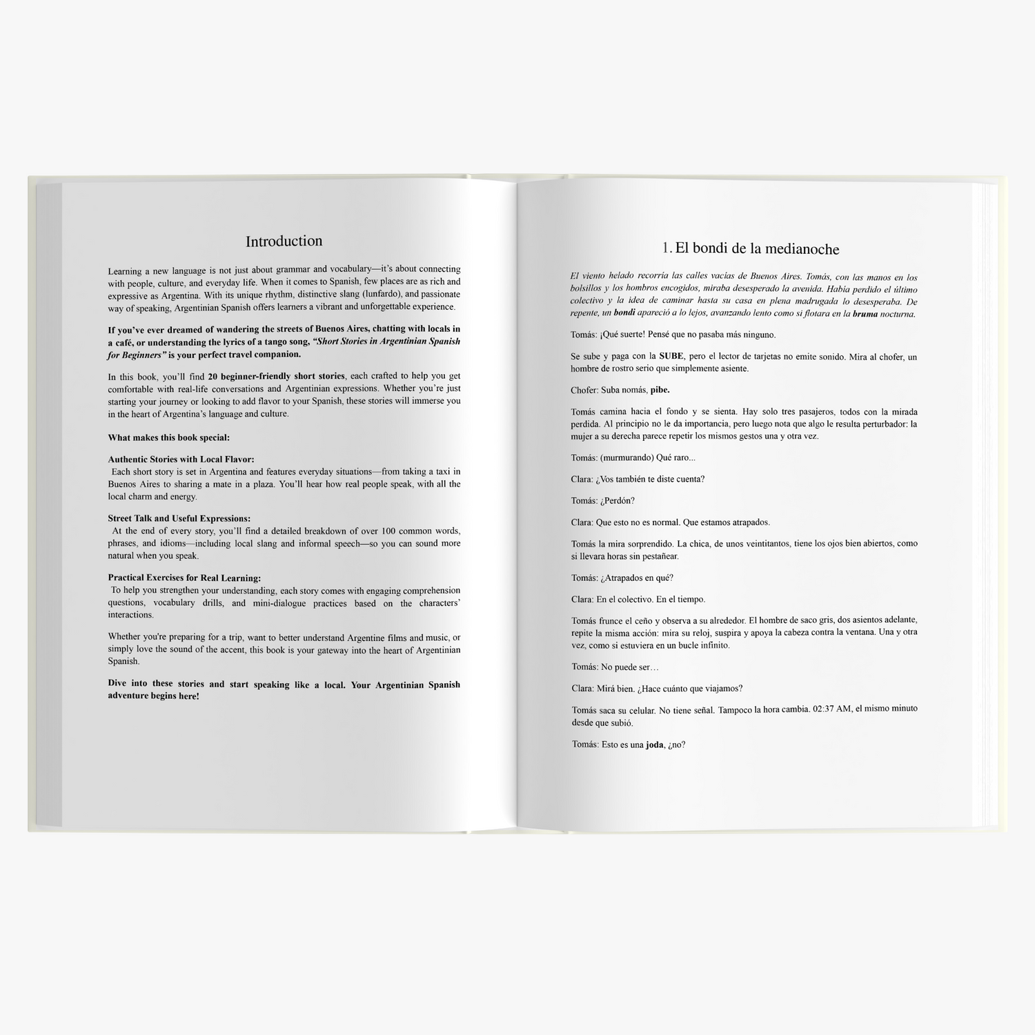 If you're just starting your Spanish journey and looking for an engaging, low-pressure way to build vocabulary, grammar, and reading comprehension, this book is ideal. The short stories in Argentinian Spanish provide an intuitive, story-based learning method that keeps you motivated while learning real-world phrases and expressions.