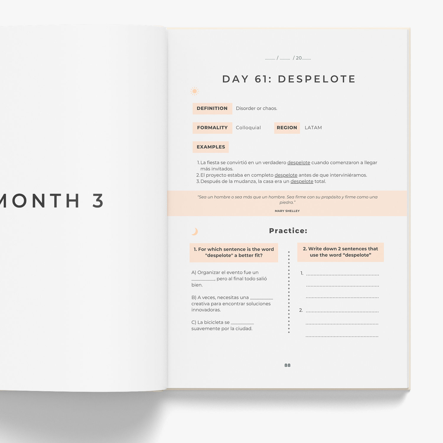 This book offers a clear and consistent 6-month routine for mastering the 180 most common words and expressions used in daily life across Spain and Latin America. Each page encourages short but meaningful engagement—combining vocabulary, contextual examples, and reflective prompts that make Spanish a natural part of your day.